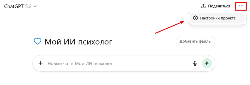 Когда вы создадите проект, сможете общаться с нейросетью в новом чате. Она будет работать только с текстом, который видит. Поэтому не стоит приукрашать или выбирать «правильные» слова. Чем честнее вы опишете ситуацию, мысли и чувства, тем полезнее будет ответ от ИИ-помощника.