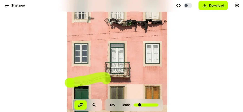 При выходе курсора за край изображения процесс очистки запускается автоматически. Сравнить результат до и после обработки, а также скачать фото можно в правом верхнем углу экрана.