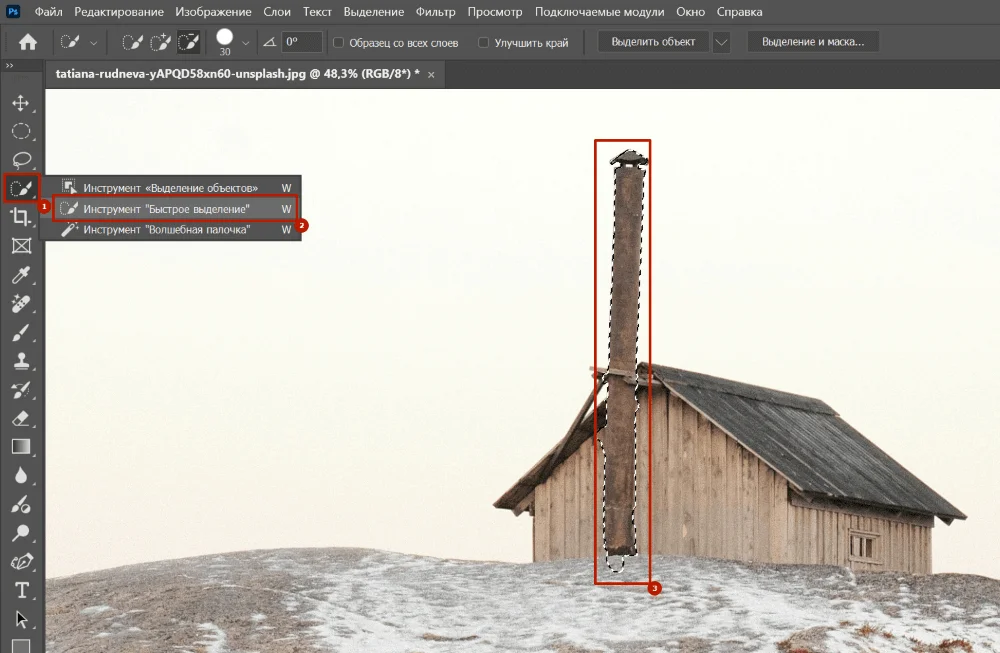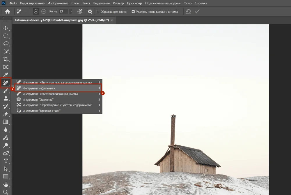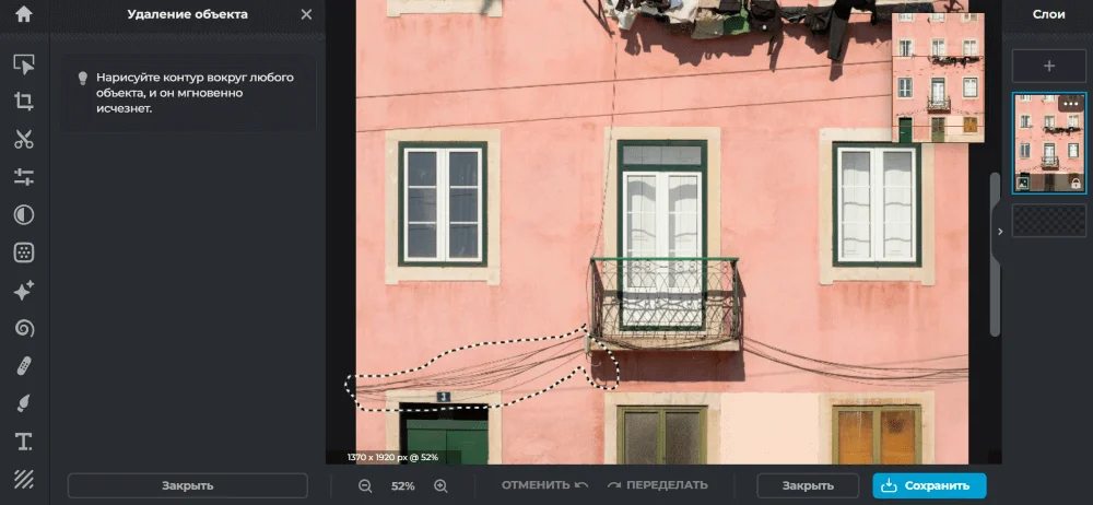 Способ №2 — через «Удаление». Выбираем этот инструмент и как кисточкой проводим по объекту. Так как он работает полностью вручную, лучше постепенно выделять сначала верх трубы над домом, затем участки возле крыши и стены — так получится контролировать процесс и вовремя подправить контур.