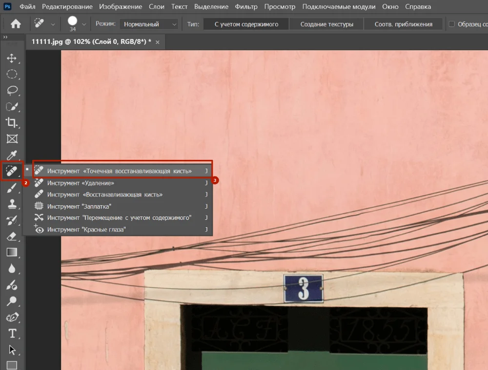 Затем выбираем инструмент «Точечная восстанавливающая кисть» и начинаем выделять провода. Лучше работать одиночными мазками, чтобы программа последовательно удаляла лишние объекты.