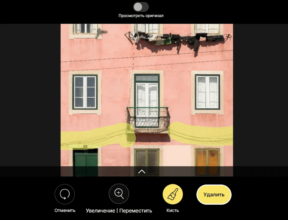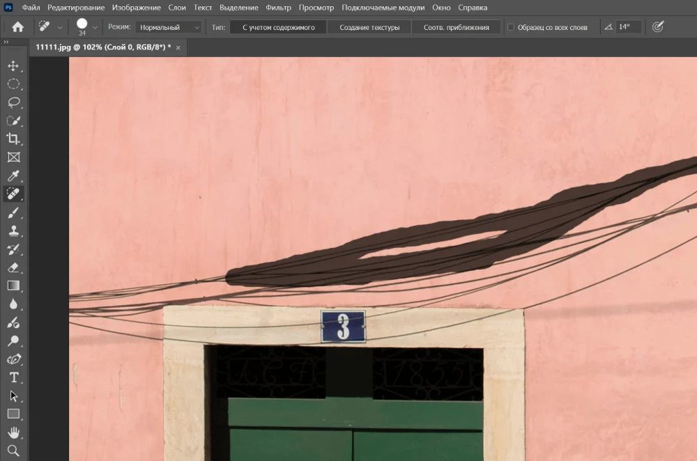 Результат. С этим инструментом у нас получилось точечно удалить лишние провода и не задеть нужные детали снимка. Дверной проем и табличка с номером на нем, балкон, тень под ним остались без изменений.