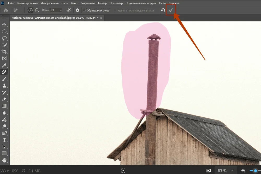 Другие способы для работы в Photoshop более мощные — с их помощью можно убрать даже крупные объекты с переднего плана, сохраняя при этом объект на заднем плане. За основу возьмем фото здания с трубой — она перетягивает на себя внимание. Попробуем убрать предмет так, чтобы стена дома и крыша не пострадали.