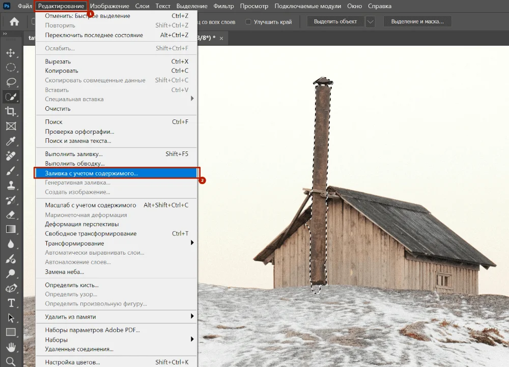 После чего переходим в панель «Редактирование» и выбираем «Заливка с учетом содержимого». Программа анализирует окружающее пространство и заполняет вырезанный объект конкретным цветом или текстурой.