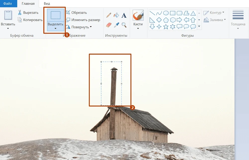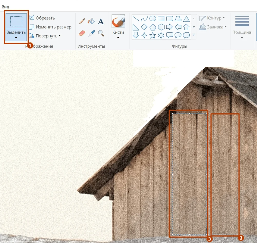 Труба осталась на самом доме. Чтобы ее убрать, снова используем функцию «Выделить» — копируем рисунок деревянной стены и вставляем поверх трубы. Из таких кусочков собираем до конца стену и крышу.