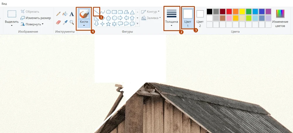 У нас остается некрасивый белый прямоугольник. Чтобы его убрать нажимаем на «Пипетку», выделяем цвет позади дома. Затем на «Заливку» и перекрашиваем фигуру. Можно выделить и скопировать фон снимка — так наши манипуляции будут еще меньше заметны.