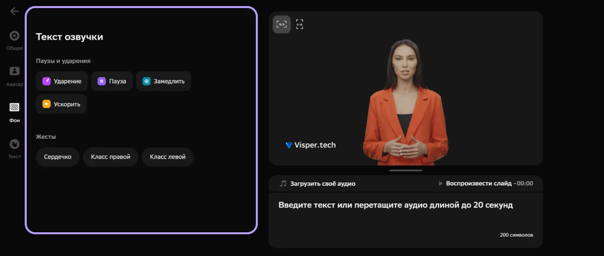Текст озвучки всё же придется написать самостоятельно — Veed.io пока не создаёт готовые сценарии. При этом для ИИ-аватара действует ограничение: не более 90 символов на одну сцену. Это позволяет сохранить естественное звучание голоса и точную синхронизацию с видеорядом.