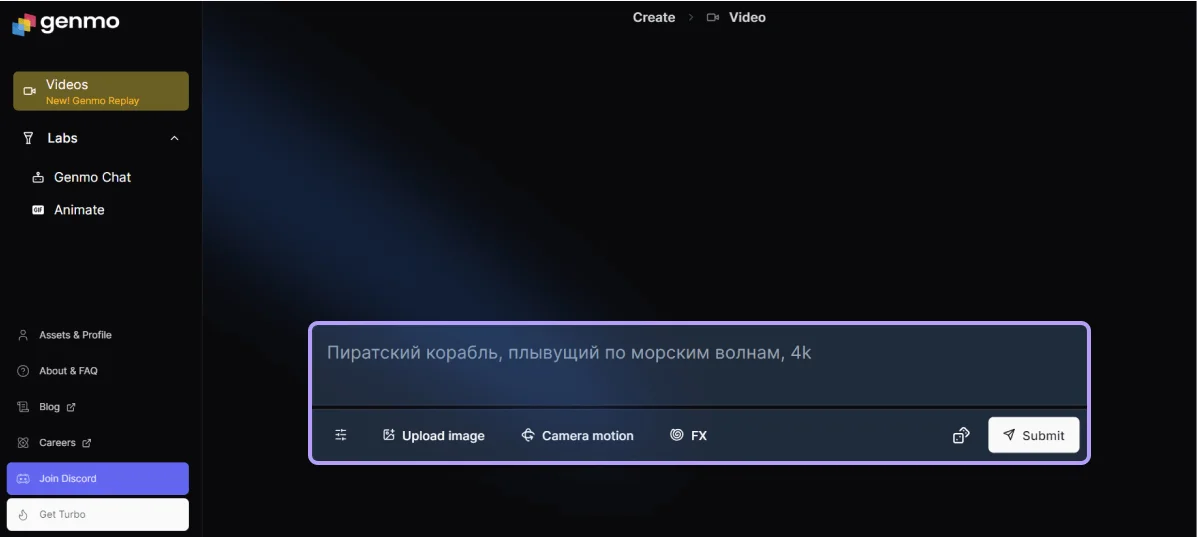 Зарегистрируйтесь в Genmo и перейдите в редактор. Введите промпт для создание видео и по необходимости измените настройки.