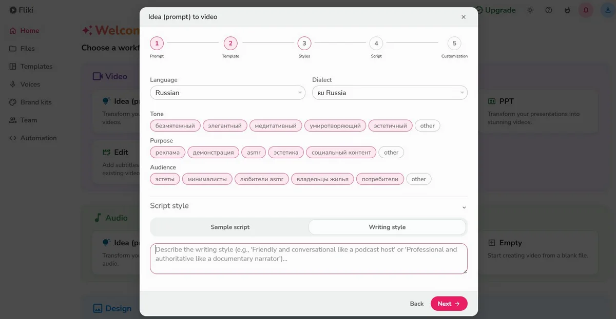 Зарегистрируйтесь или войдите в аккаунт на сайте Fliki. На главной панели нажмите Idea (prompt) в разделе Video. Задайте имя проекта, язык озвучки и соотношение сторон (например, 16:9 для YouTube или 9:16 для Stories).
