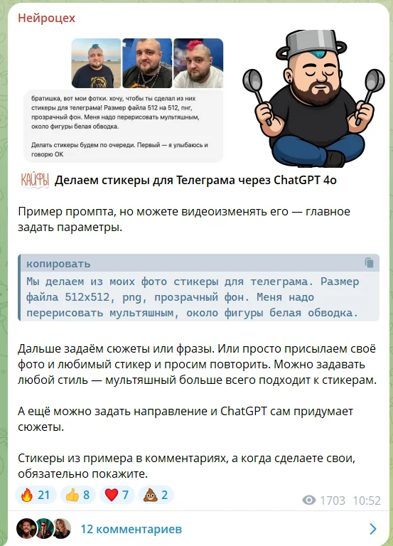 О чем пишут. Это канал от организаторов закрытого сообщества — что-то вроде открытого филиала. Здесь выкладывают кейсы, заметки и промпты от участников: как автоматизировали холодные письма, сгенерировали лендинг или сделали аватары для блога.