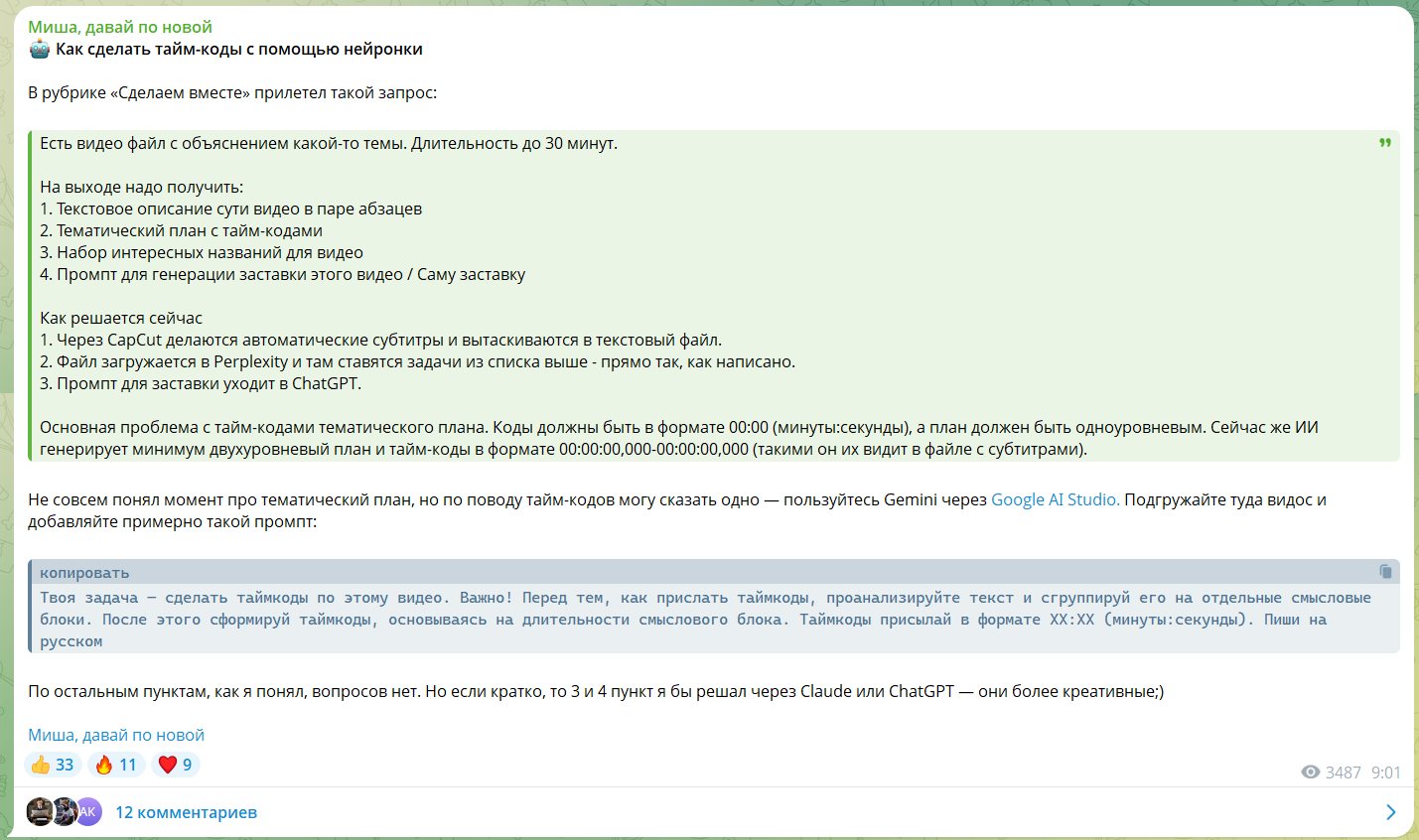 О чем пишут. Тема канала за последний год сместилась с автоматизации и вайб-кодинга к визуальному контенту, особенно генерации видео по текстовому промпту.