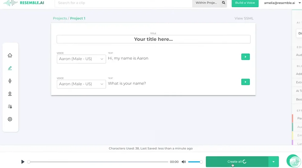 Онлайн-сервис для клонирования голоса и синтеза речи, доступен только в веб-версии. Интерфейс только на английском языке. Чтобы создать клон голоса, достаточно загрузить аудиозапись продолжительностью около 3 минут или прочитать текст и записать его в интерфейсе сервиса. Нейросеть создает клон в течение примерно 45 минут, в зависимости от нагрузки на сервер. Можно управлять тоном и высотой голоса, добавлять эмоции, выбрать скорость воспроизведения отдельных слов и другие параметры. Также в Resemble AI есть своя большая библиотека голосов.