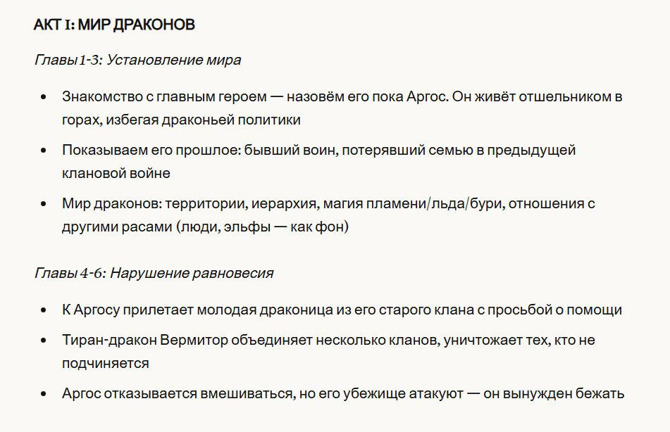 - Разработать сюжет и логичную структуру. ИИ сгенерирует несколько вариантов развития сюжета, придумает сильные концовки, опишет конфликты между персонажами, разложит книгу на главы.
