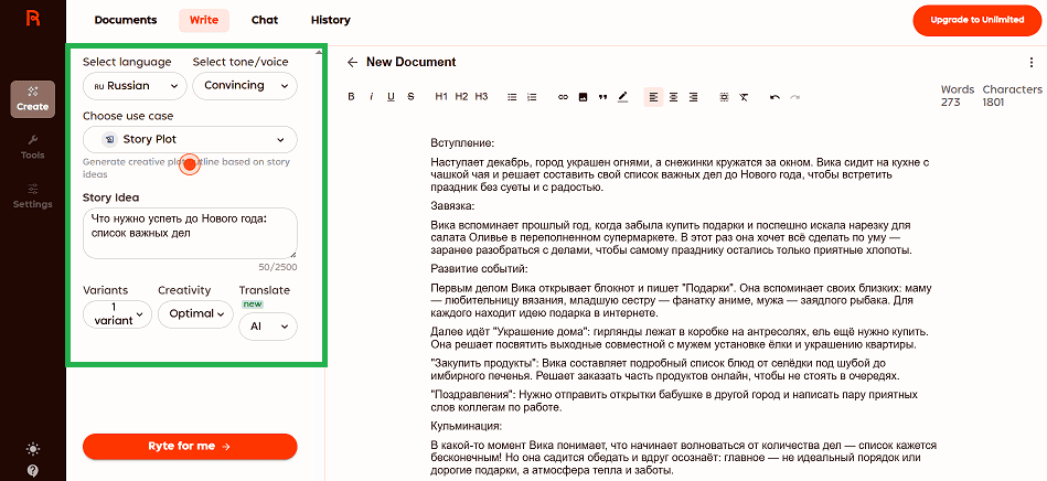 Удобный ИИ-помощник, который поможет подготовить черновики глав или сборник рассказов. Позволяет тонко настраивать стиль изложения и степень креатива. Есть десятки готовых шаблонов для текстов разных форматов. Можно закинуть в чат буквально одну строчку, задать настройки вывода — и получить через секунду готовый набросок рассказа.