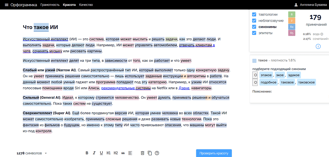 Специализированный онлайн-сервис для глубокой и всесторонней проверки текст на русском языке. Он анализирует стилистику, находит тавтологии и неудачные сочетания, оценивает «красоту» и удобочитаемость текста, предлагая понятные пояснения к правилам. Незаменим на финальном этапе подготовки рукописи, чтобы довести ее до грамотного и стилистически выверенного состояния.