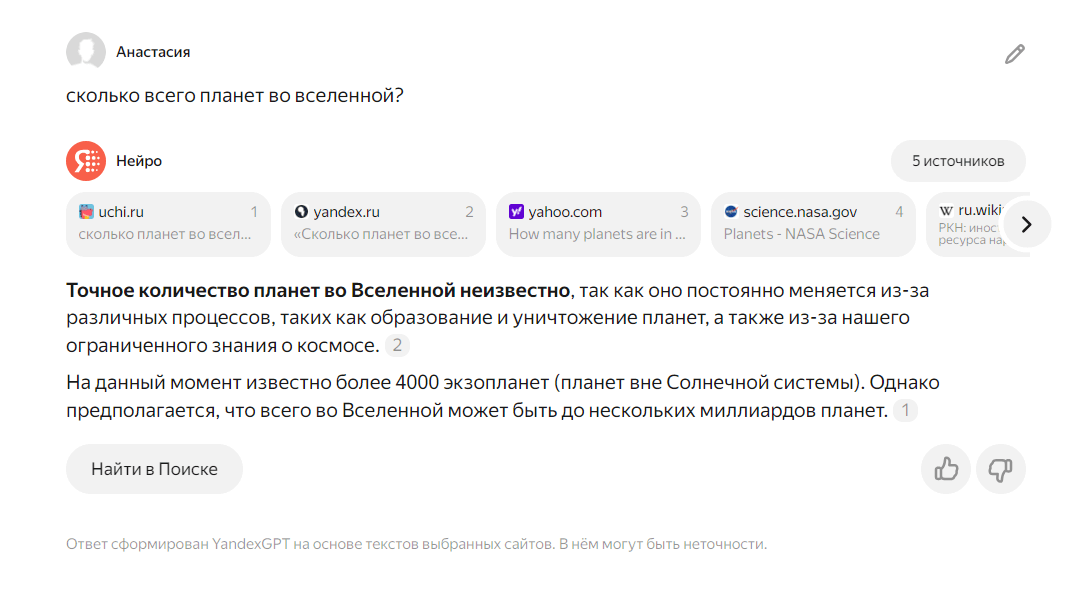 | Для поиска информации | Яндекс Нейро |