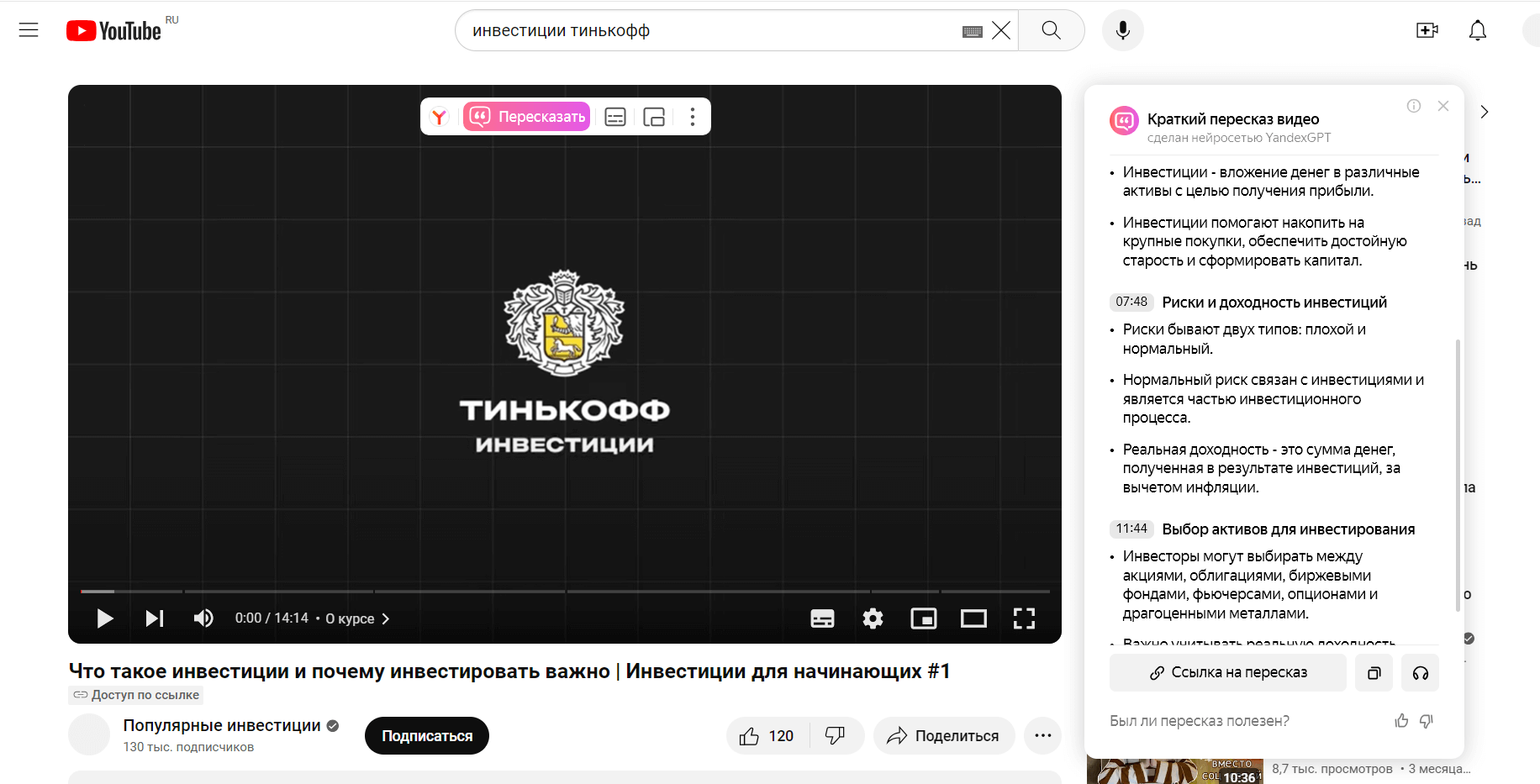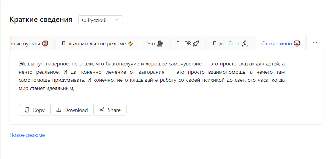 Минус — нейросеть работает как расширение в Яндекс Браузере. Зато при открытии статьи или видео на YouTube она автоматически предложит пересказать материал.