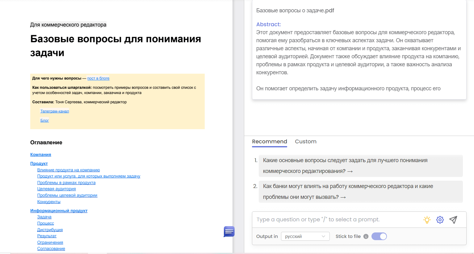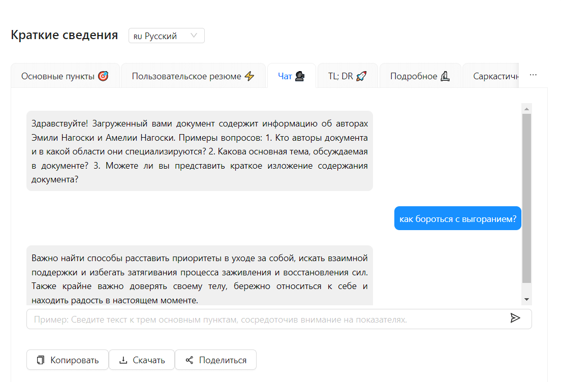 ChatDOC даёт краткое описание информации из документа. Когда сервис проанализирует файл, можно задавать вопросы: нейронка ответит на них на основе документа. Также сервис рекомендует вопросы, с помощью которых можно углубиться в материал. Понимает русский язык и отвечает на нем же.