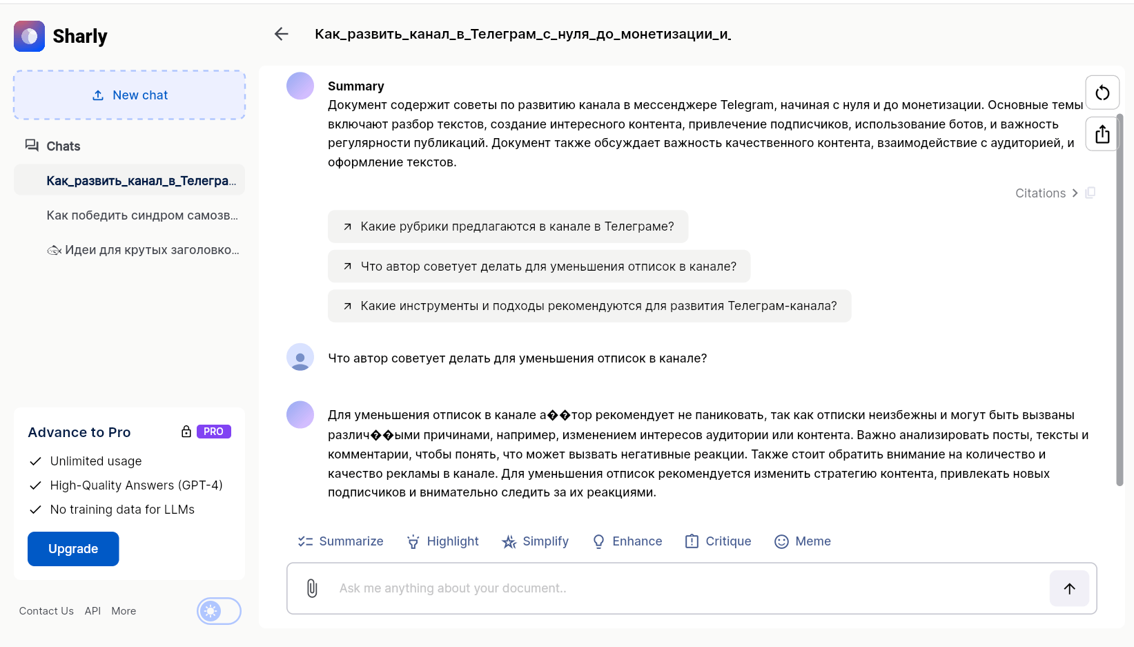 Подписка Pro работает на базе GPT-4. По этой подписке скоро можно будет анализировать сразу несколько документов.