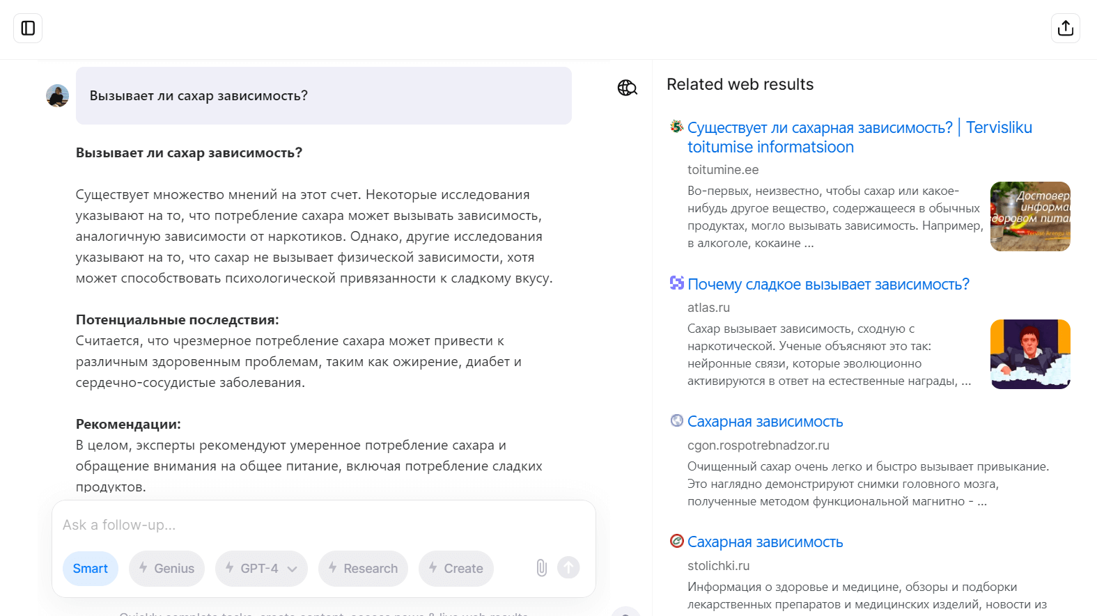 Andi — гибрид чат-бота и поисковика. На любой вопрос нейросеть подготовит краткий ответ и приведет релевантные источники. Правда, при ответе будет небольшая задержка, потому что сервису нужно обработать запрос и проанализировать информацию в интернете. Задавать вопросы можно на русском — сервис ответит на нем же.