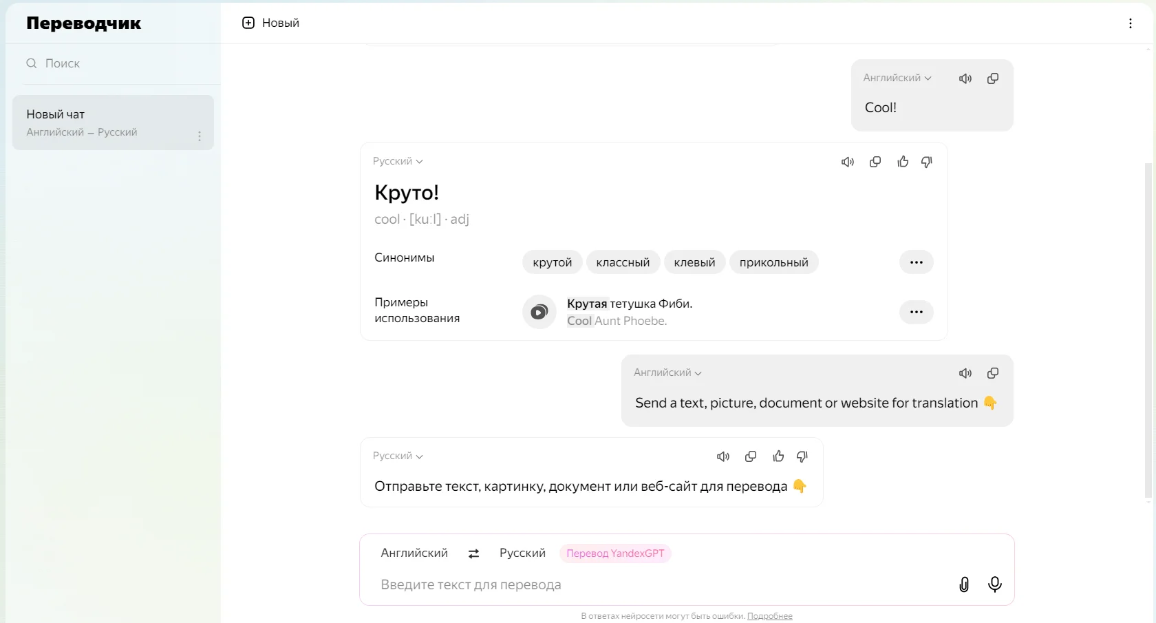 Яндекс Переводчик тоже работает на базе YandexGPT. Нейросеть выбирает более подходящие варианты перевода слов и фраз, учитывает контекст и особенности языка. Создает несколько вариантов перевода, из которых можно выбрать наиболее подходящий.