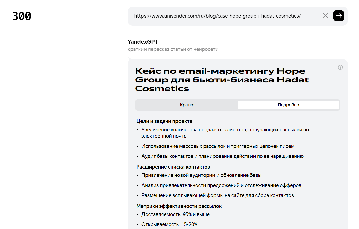 300ya — это сервис для создания краткого пересказа видео, статей и текстов. Пригодится, если нужно сделать выжимку для блока « О главном»: вставляете текст и получаете пересказ всего важного по пунктам. Этот сервис может быстро обработать текст объемом до 3 000 000 знаков, а потом сократить его до небольшого конспекта на 300– 1000 знаков. А также разбить на пункты и отдельные тезисы.