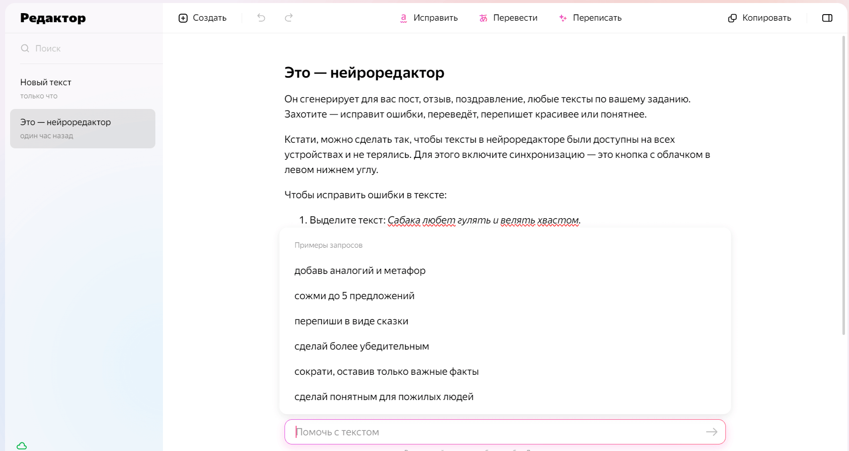 Редактировать текст в нейронке можно по промпту: скопируйте текст, с которым вы работаете, и допишите в строку подсказки, что с ним нужно сделать. Например, изменить стиль, переписать от первого лица или заменить «она» на «он».