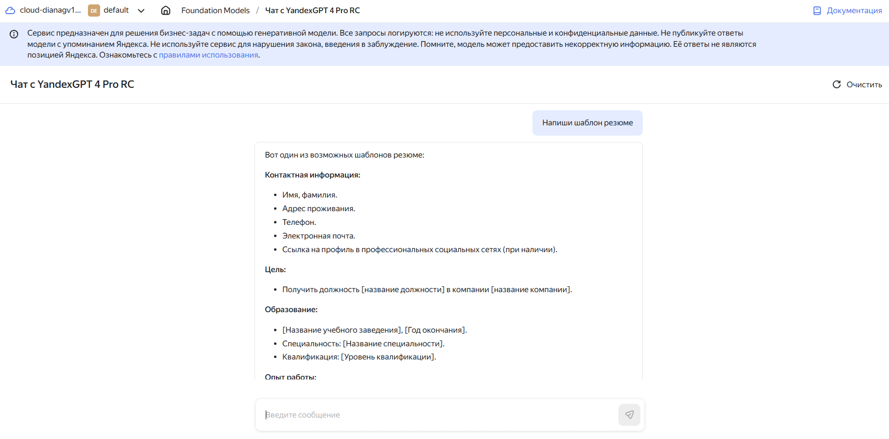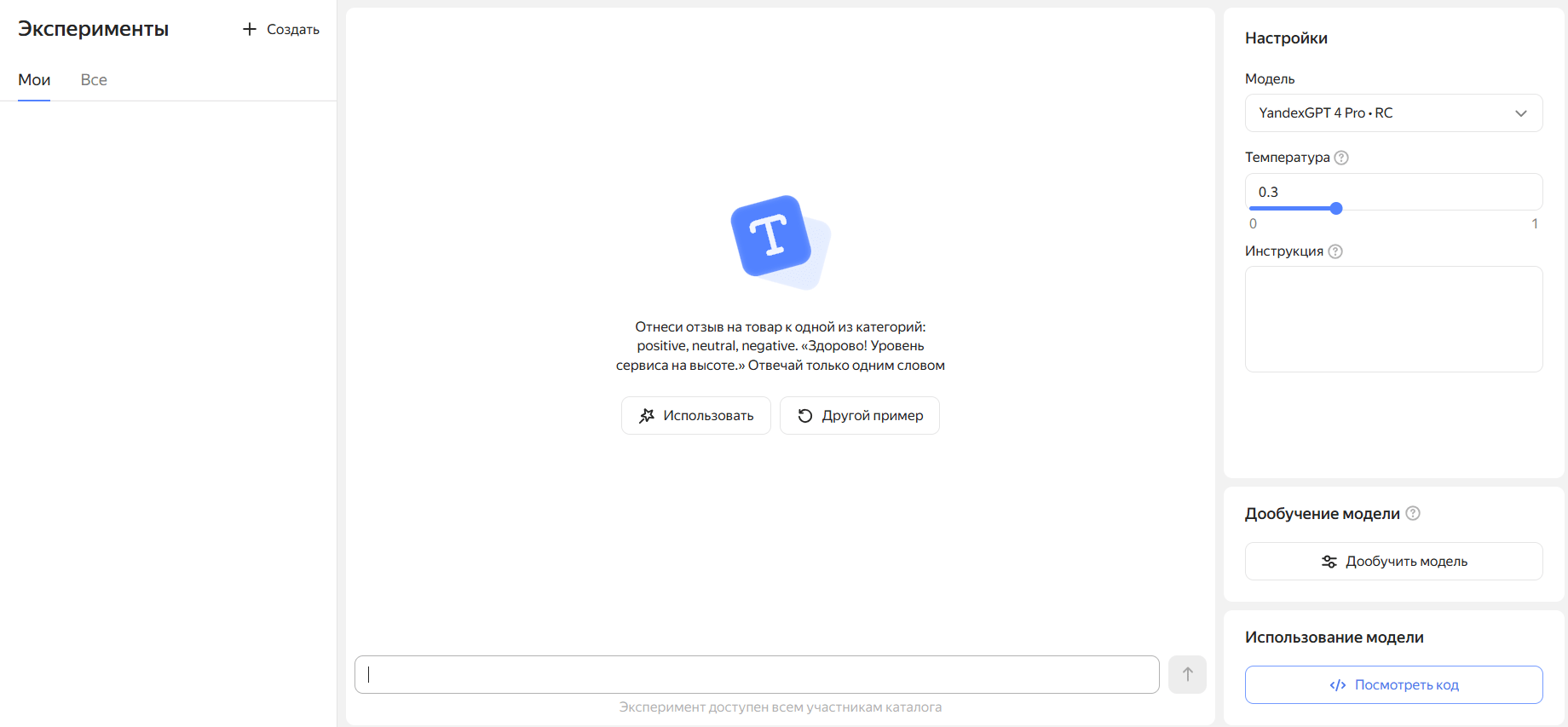 AI Playground. Это платформа для экспериментов с ИИ моделями. Например, здесь можно работать с разные версиями YandexGPT: YandexGPT 4 Pro, YandexGPT 3 Pro, YandexGPT Lite.