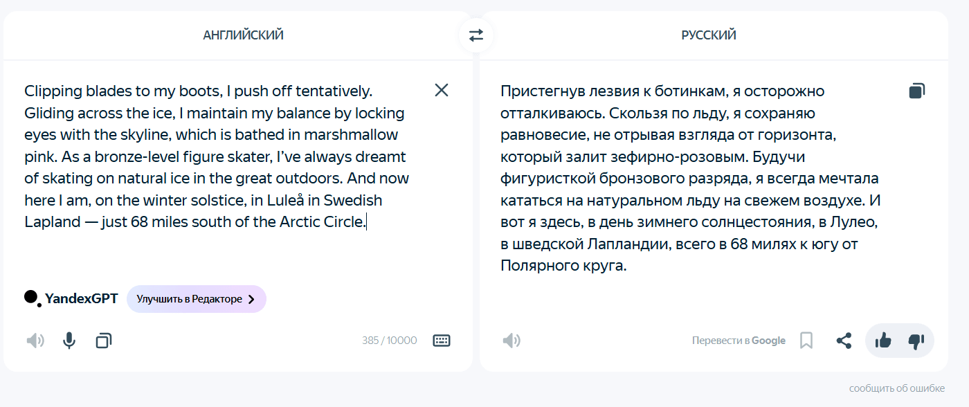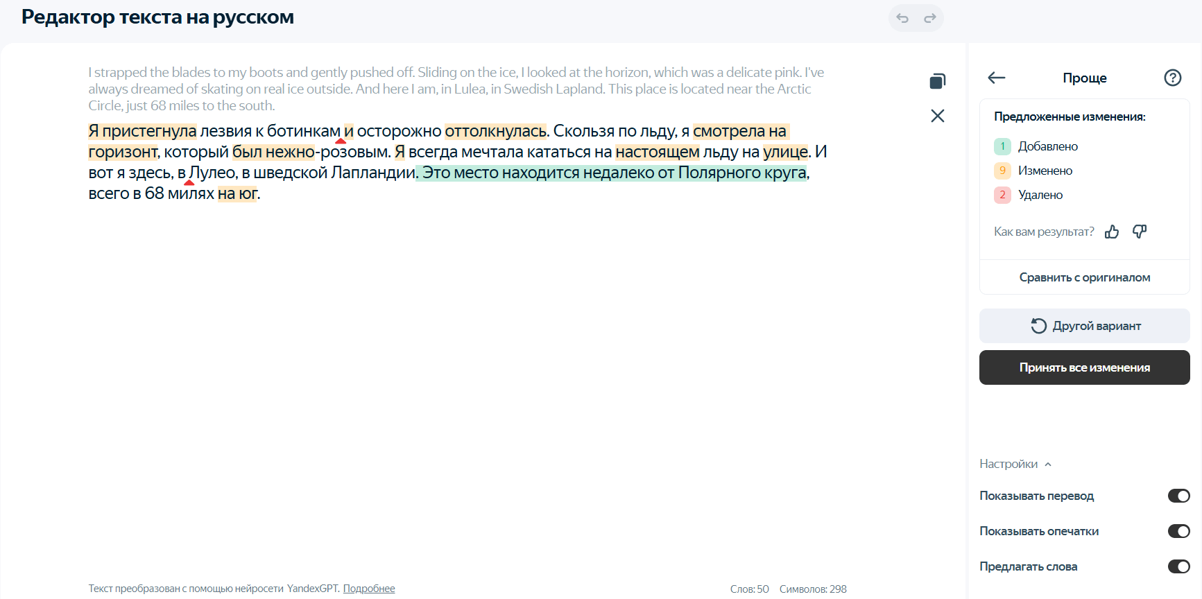 Перевод текста можно улучшить в редакторе с YandexGPT. Выберите, что именно нужно изменить: упростить формулировки, сделать стиль более разговорным или наоборот — более формальным.
