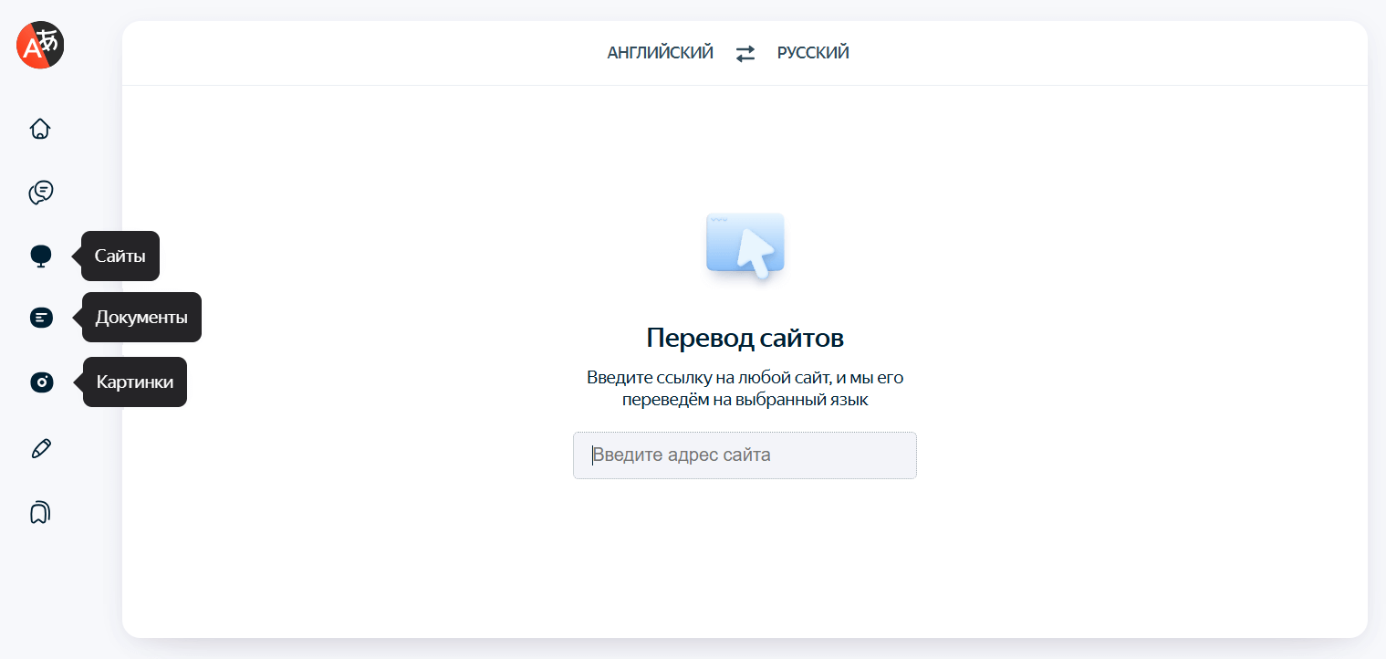 Переводчик — это окно для перевода текста или любого файла. Над полем для ввода текста можно выбрать язык. В отличие от Яндекс Переводчика, здесь нельзя дорабатывать итоговый текст.