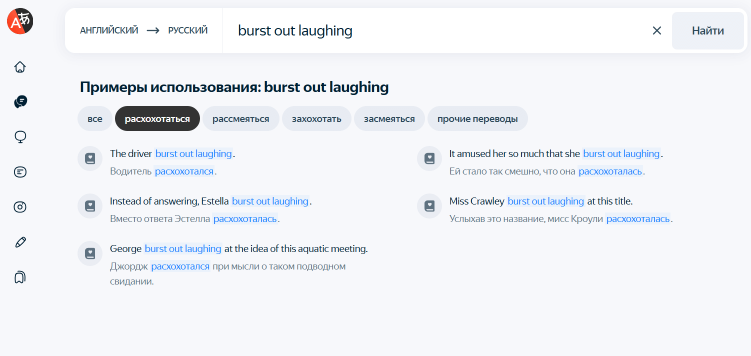 Еще в Яндекс Переводчике есть примеры перевода текста. Можно ввести слово или фразу и посмотреть, как их переводят в разном контексте.