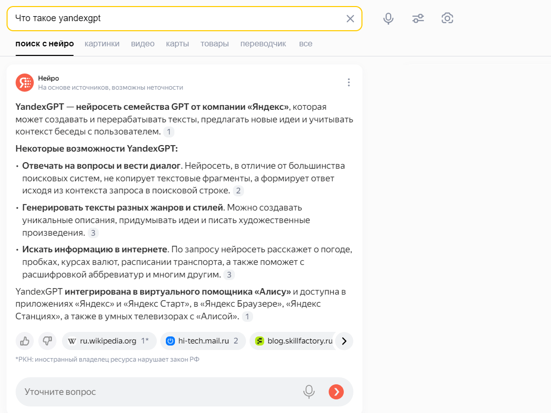 Нейро работает как поисковик, только вместо ссылок на релевантные источники сервис сразу дает ответ на ваш запрос. Он самостоятельно ищет информацию в интернете, обобщает ее и генерирует ответ.