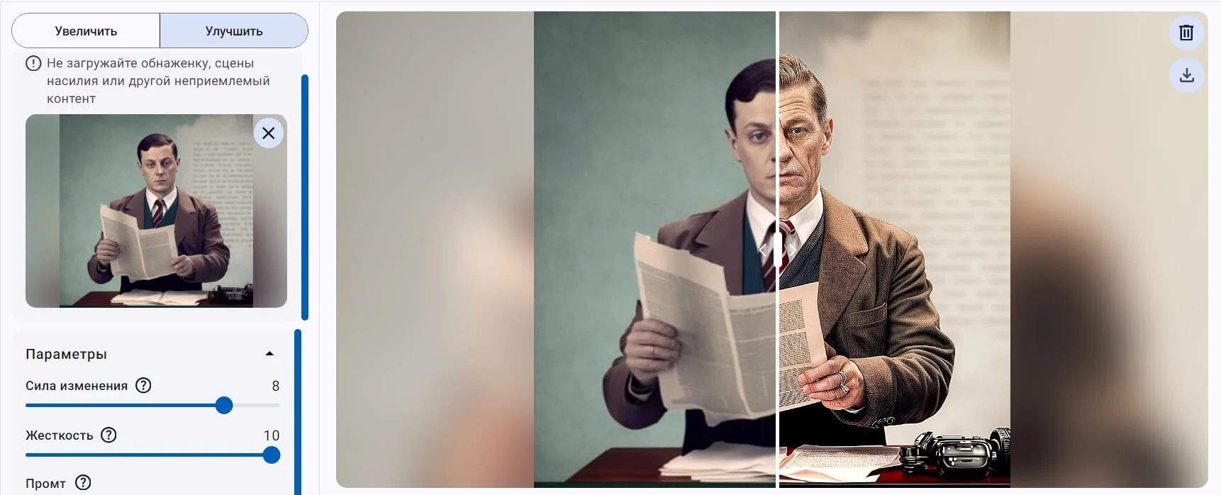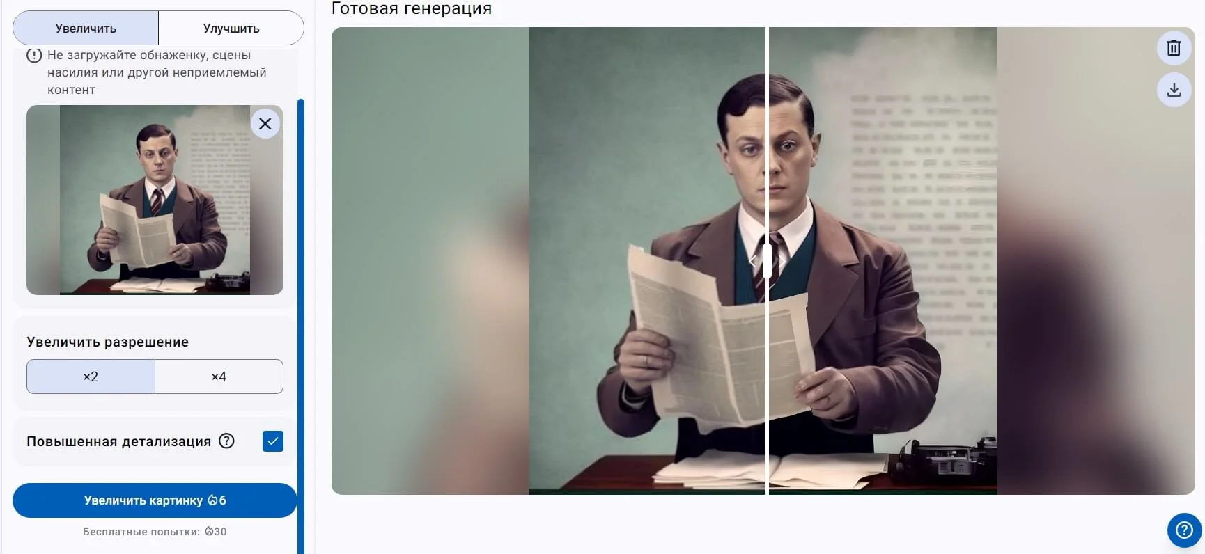 - Upscale увеличивает разрешение изображения в 2 или 4 раза.
