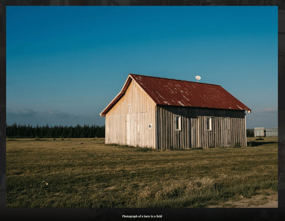 Пример простого запроса «Фотография сарая на поле» с сайта Black Forest Labs — разработчика FLUX.