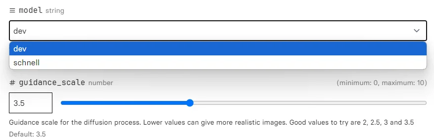 На той же странице меняем [dev] на [schnell]. Кликаем на выпадающий список в разделе model и выбираем нужную версию.