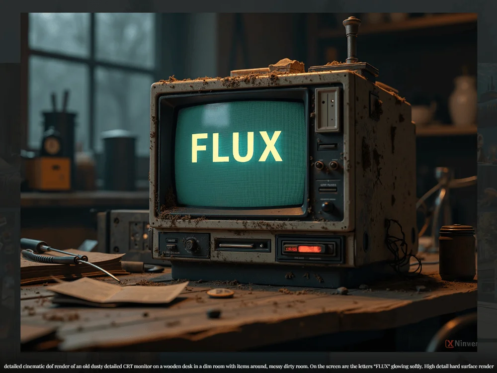 А вот так выглядит изображение, сгенерированное по более сложному промпту: «Подробный кинематографический рендеринг старого пыльного детального ЭЛТ-монитора на деревянном столе в тусклой комнате с предметами вокруг, грязной грязной комнате. На экране мягко светятся буквы FLUX. Высокодетализированная визуализация твердой поверхности».
