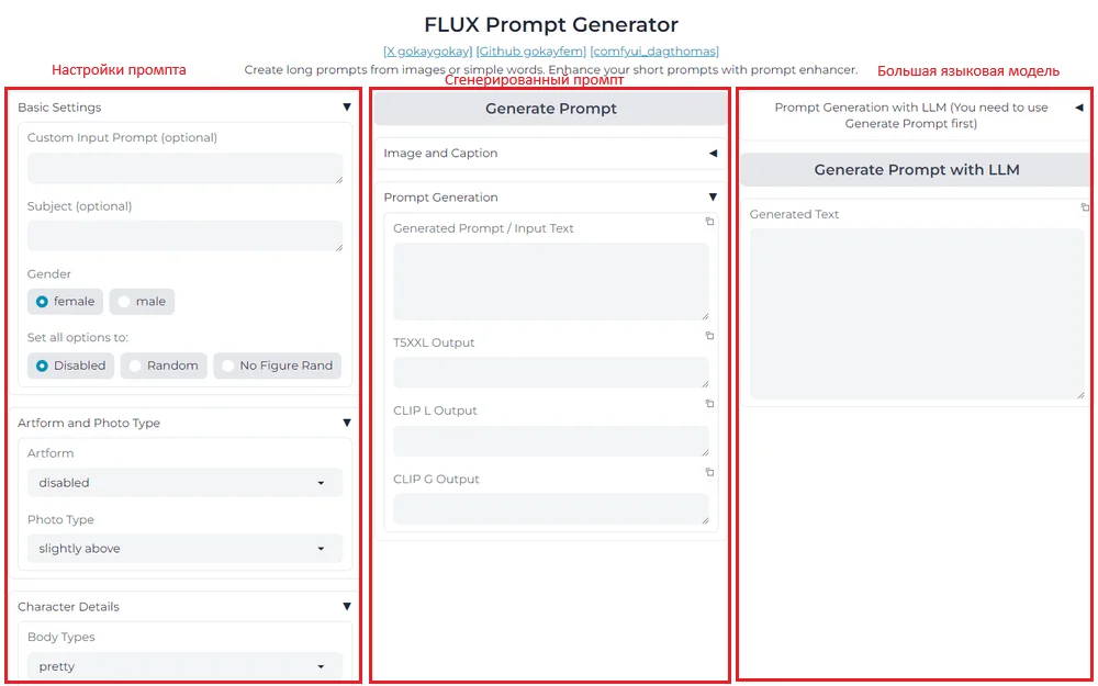 Генератор промптов в HuggingFace. Первый столбец — настройки. Можно указать пол, телосложение, прическу, ракурс и детали картинки. Добавить стиль какого-либо фотографа или художника.