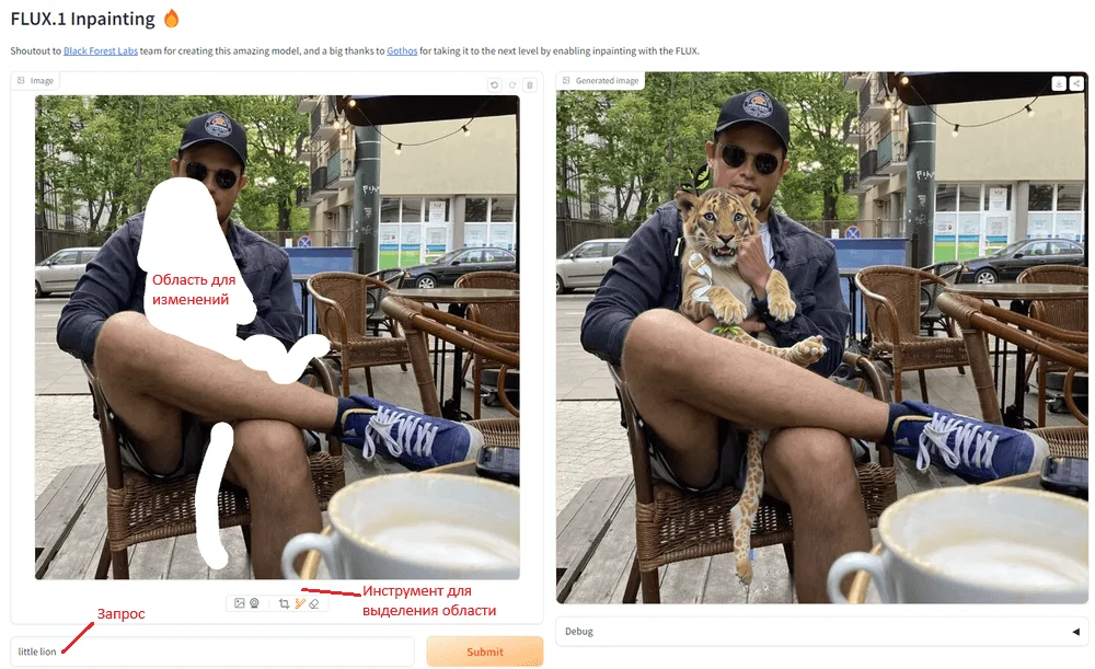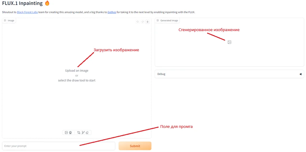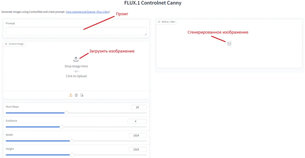 Интерфейс простой: слева — поле для загрузки картинки, под ним — строчка для промпта, справа — зона для сгенерированного изображения.