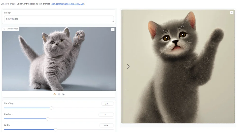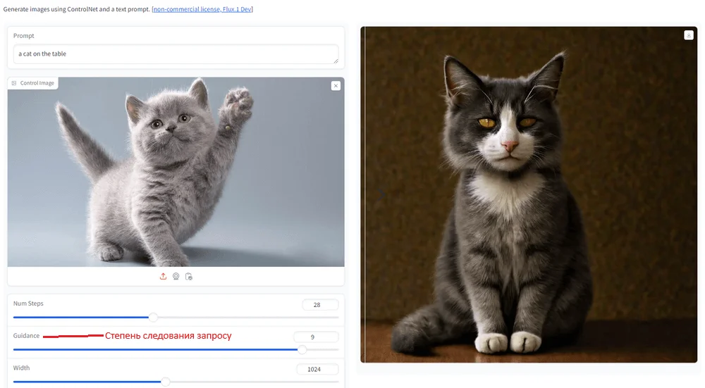 Controlnet корректно создает изображение по загруженной картинке. При базовых параметрах получается нейросетевая копия исходника, без дополнительных деталей. А если повысить степень следования запросу, FLUX точнее выполнит промпт, но он может сильно отличаться от исходной картинки.