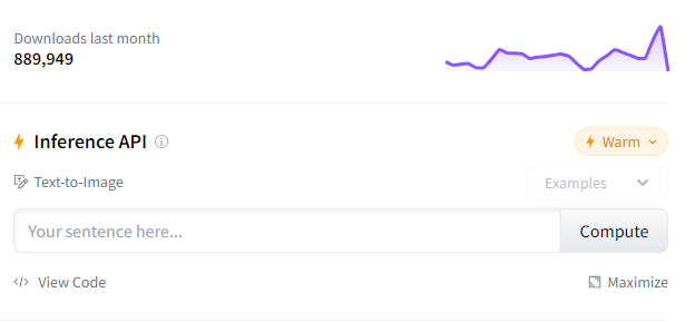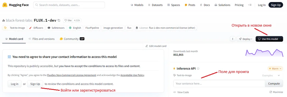 Сначала нужно войти или зарегистрироваться на платформе HuggingFace. После регистрации можно пользоваться моделькой. Писать запрос можно в строке Text to Image справа, либо сначала кликнуть на Use this model. Нейронка откроется в новом окне, где не будет лишней информации.