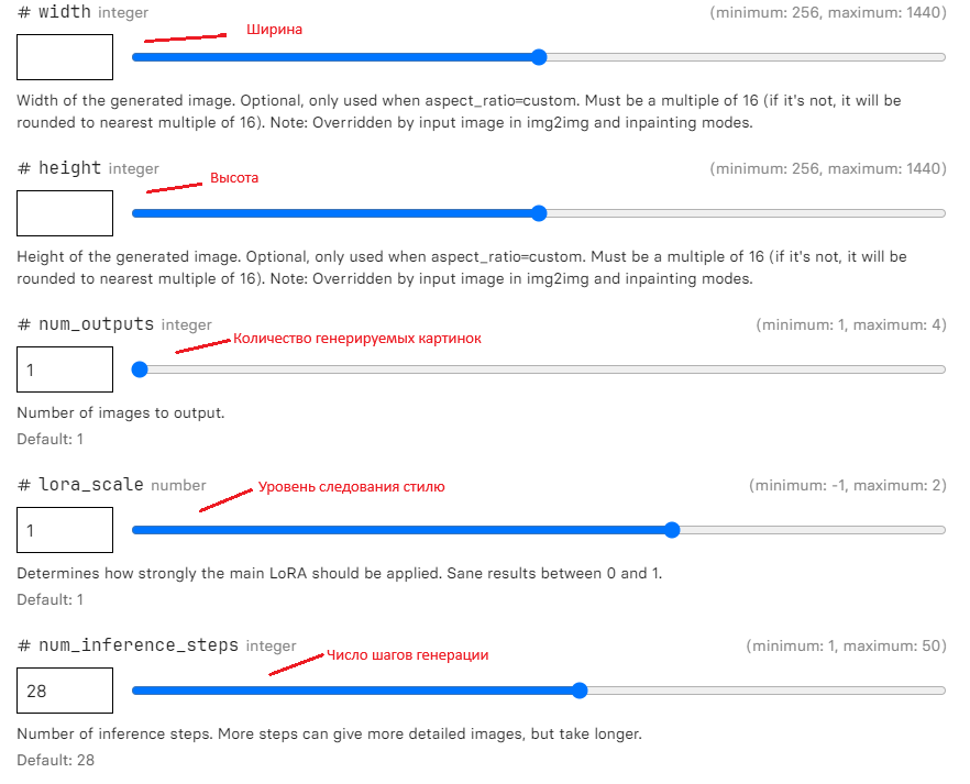 При желании можно настроить, например, ширину и высоту изображения, количество генерируемых картинок, число шагов, которое сделает нейросеть, чтобы выдать изображение, формат картинки (WebP, JPG, PNG).