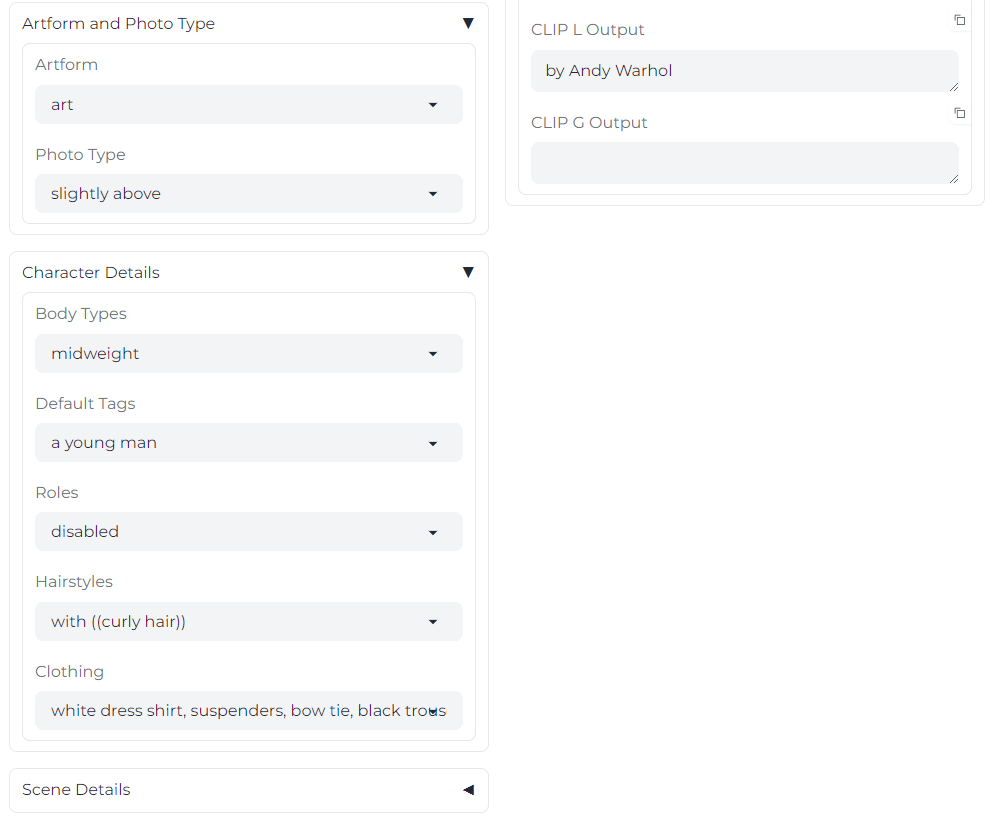 Для примера выберем: арт, ракурс слегка сверху, среднее телосложение, молодой мужчина, вьющиеся волосы, белая рубашка, подтяжки, бабочка, черные брюки. Картинка — в стиле художника Энди Уорхола.