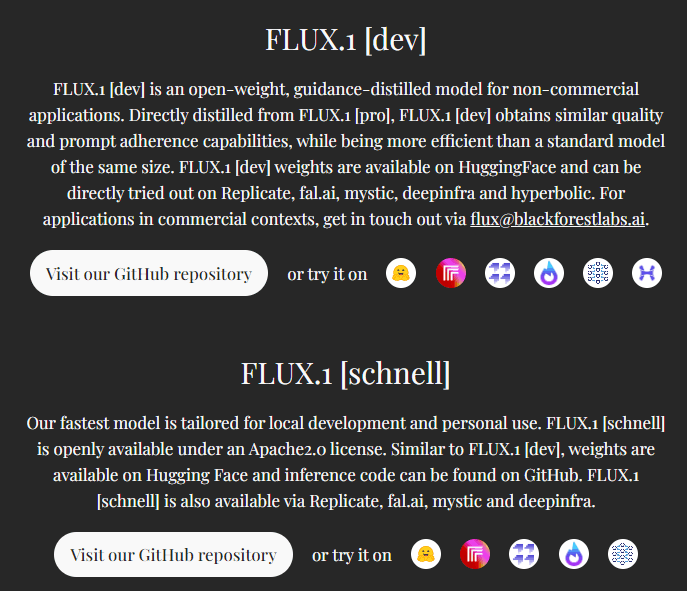 FLUX.1 [dev] — модель доступна на HuggingFace, Replicate, fal.ai, mystic, deepinfra и hyperbolic. Качество и точность не уступают pro-версии, но «эффективность выше, чем у стандартной версии того же размера». Генерации нельзя использовать в коммерческих целях. Можно работать бесплатно, при генерации через API за каждую картинку нужно платить $0,03.