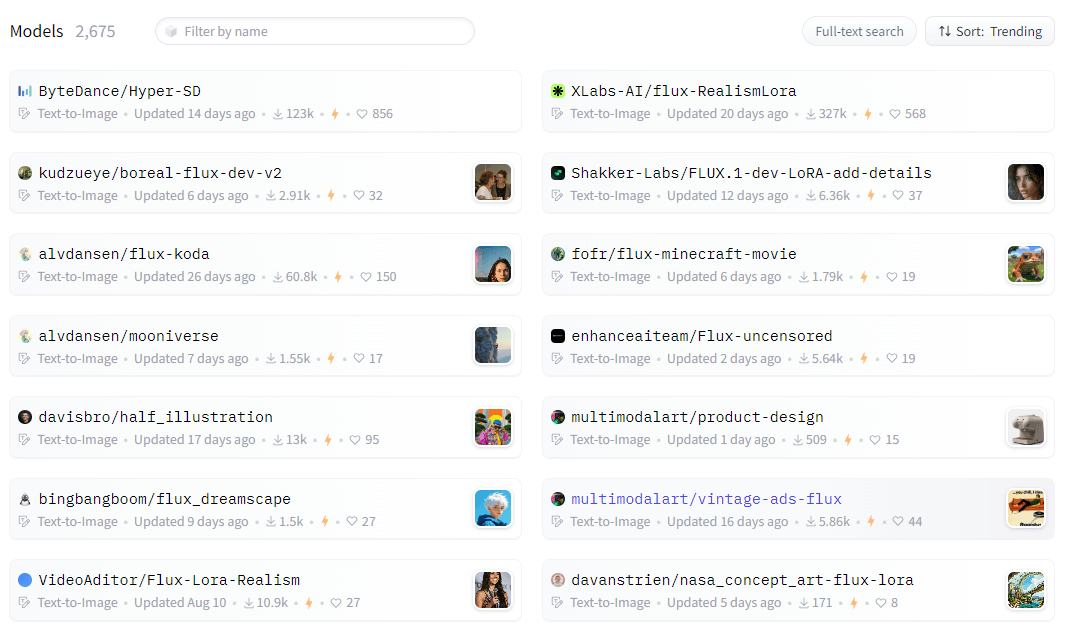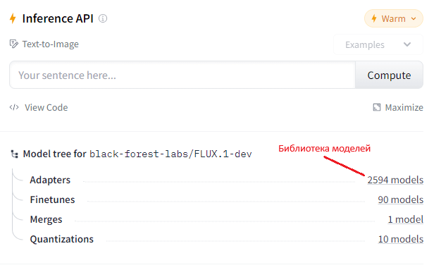Из примечательного: у FLUX есть библиотека моделей, где можно скопировать стиль. Ссылки на исходники — прямо под полем для промпта. Нас интересует раздел Adapters, для него ссылкой указано количество моделей — 2594 models.