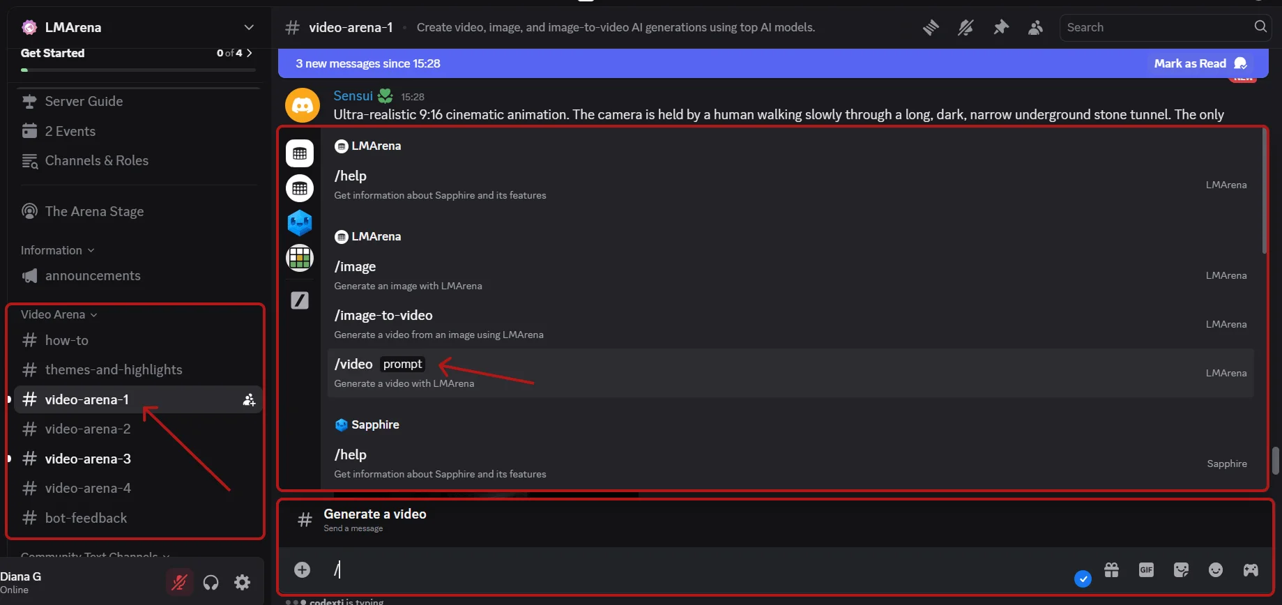 - В канале video-arena-1, 2 или 3 ввести команду /video или /image-to-video.