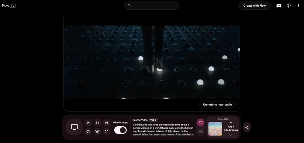 Найти вдохновение для промптов можно на Flow TV — это сайт с бесконечным видеорядом сгенерированных в Veo 3 роликов.