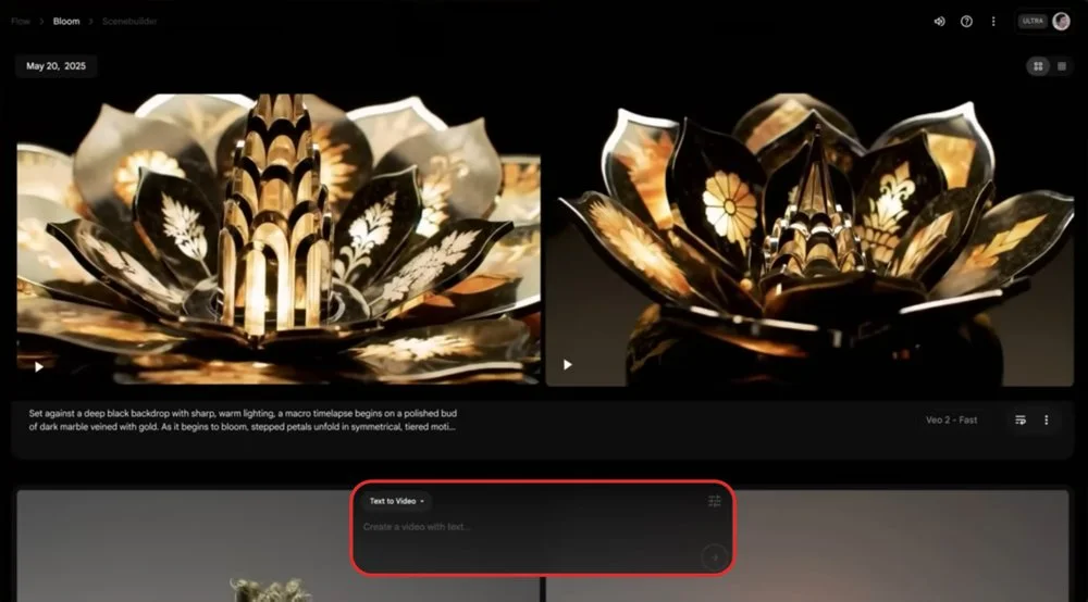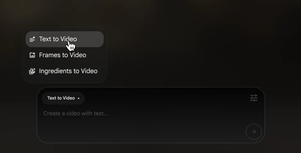 При создании нового проекта вы увидите поле ввода запроса — оно по умолчанию работает в режиме Text to video. Достаточно ввести промпт, и Flow сгенерирует клип.