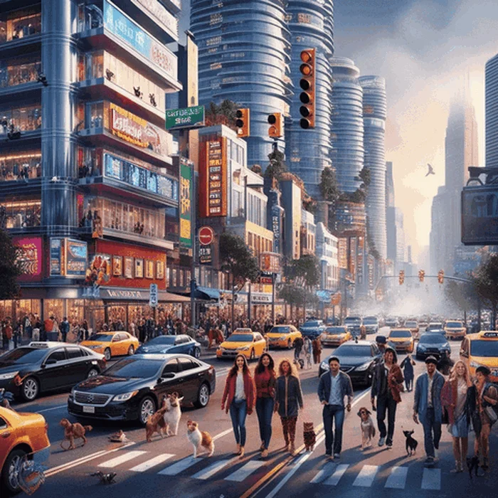 В сгенерированных картинках со множеством мелких элементов тоже встречаются баги — при ближайшем рассмотрении детали оказываются размытыми или плохо прорисованными. В примере ниже нейросеть Leonardo AI нарисовала городской пейзаж, где в воздухе висят светофоры, у некоторых людей перекошенные лица, а у собак их вовсе нет.