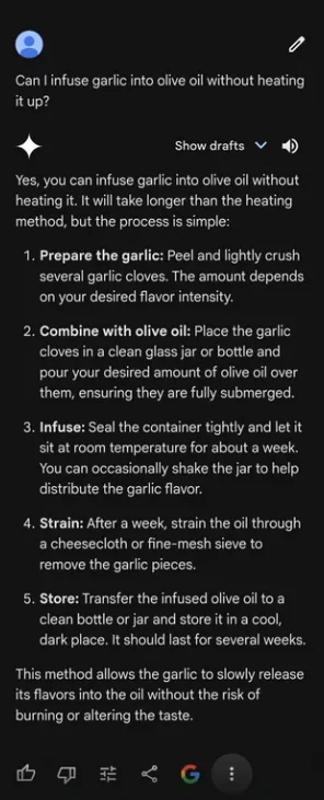 Другая текстовая нейросеть Gemini посоветовала рецепт заправки для салата из оливкового масла и чеснока. К счастью, пользователь вовремя заметил странные пузырьки и решил перепроверить информацию. Оказалось, что он вырастил бактерии ботулизма, которые вызывают тяжелейшее отравление.