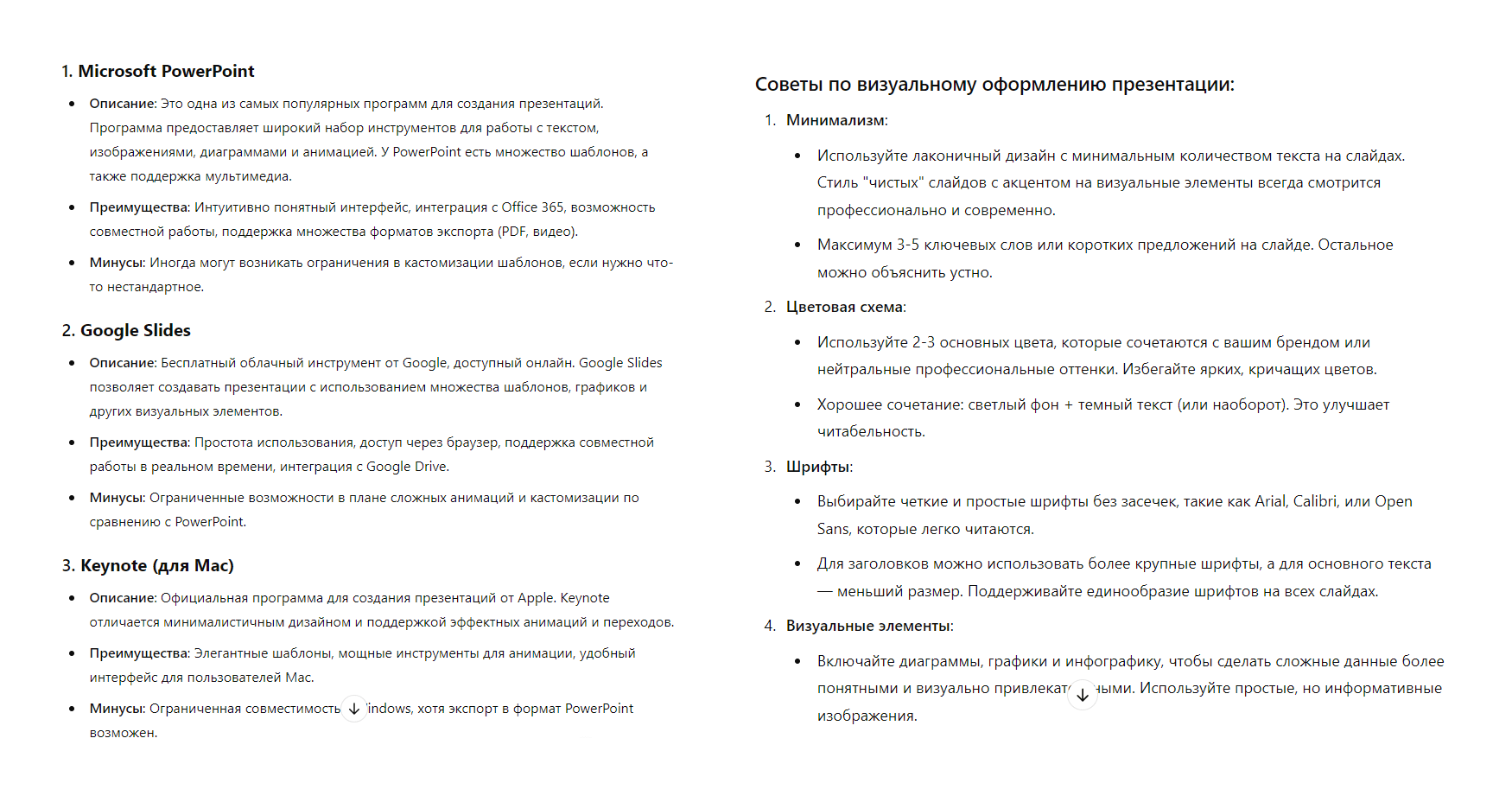 Для примера отправим промпт о презентации в нейросеть ChatGPT: «Мне нужно сделать презентацию для B2B-клиентов о нашей новой услуге — оптимизация сайтов и их продвижение. Расскажи, в каких программах можно сделать презентацию, опиши их. Также дай советы, по визуальному оформлению презентации, чтобы она выглядела стильно и современно». Вот что программа ответила: