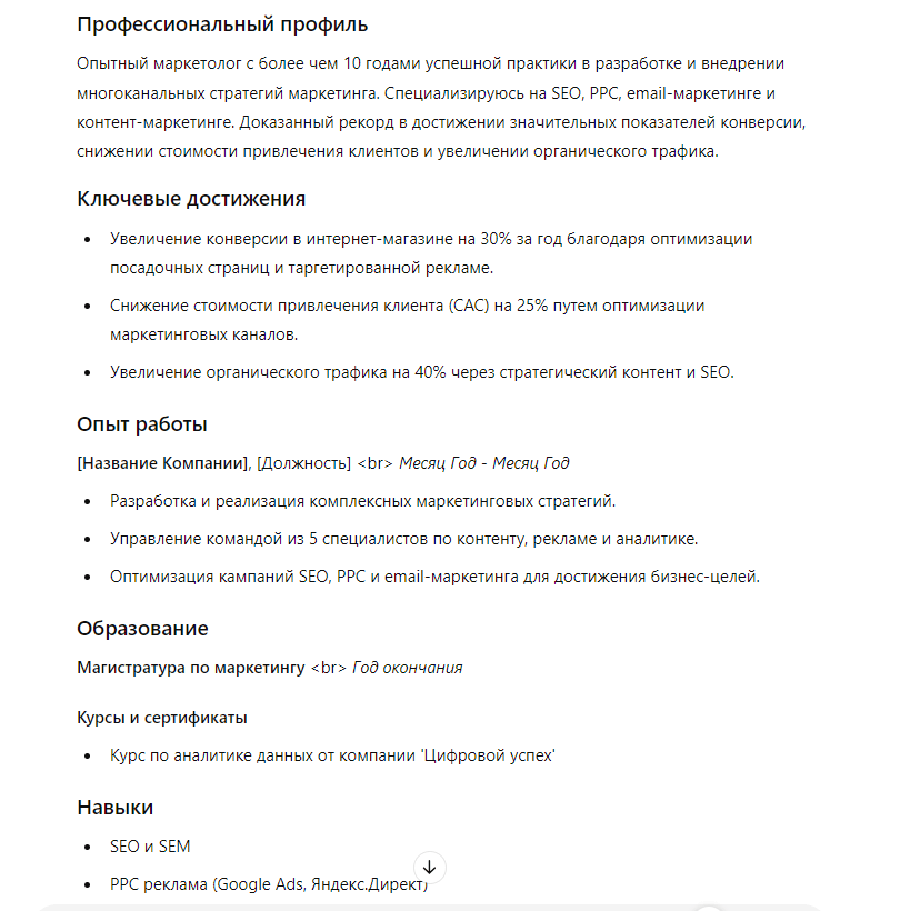 Например, подойдет такой промпт: «Мне нужно создать резюме для должности маркетолога в компании с фокусом на цифровой маркетинг. У меня 10 лет опыта в маркетинге, включая разработку стратегий и реализацию многоканальных кампаний (SEO, PPC, email-маркетинг, контент-маркетинг).
